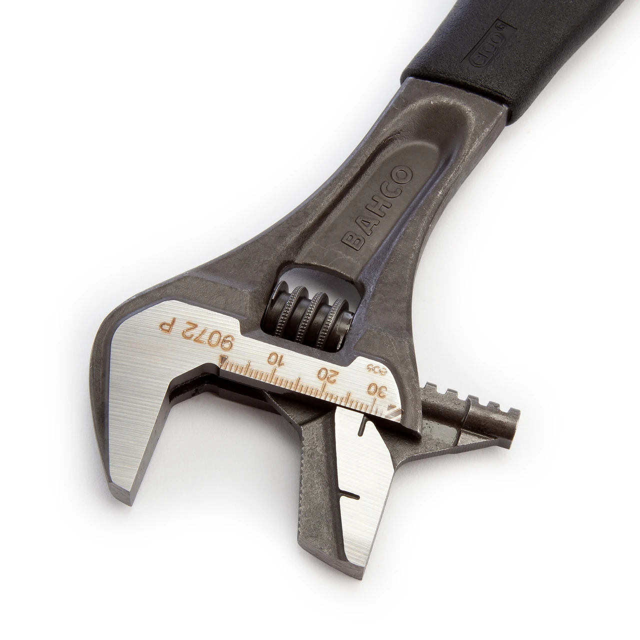 The Bahco 9072P Adjustable Wrench features the same spec as the original 9072, only with a larger 33mm jaw capacity. This model gives the user maximum comfort with minimum effort thanks to its ergonomic design. Achieving extra comfort and a better grip with the slip-free handle and improved access in confined spaces with the slim 15° angled jaws. Ultimate strength through precision hardening and high-performance alloy steel.