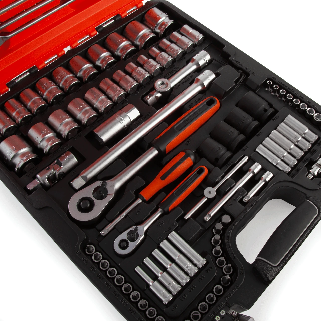 The Bahco S106 is a 106 piece socket set with 1/4″ and 1/2″ drive sockets and combination spanners. This kit contains a huge range of tools all in the one hardy High-Density Polythene (HDPE) Carry Case, allowing for ease of transportation across the job site. The sockets are made from high-performance alloy steel in a matte finish for optimum durability and long life.