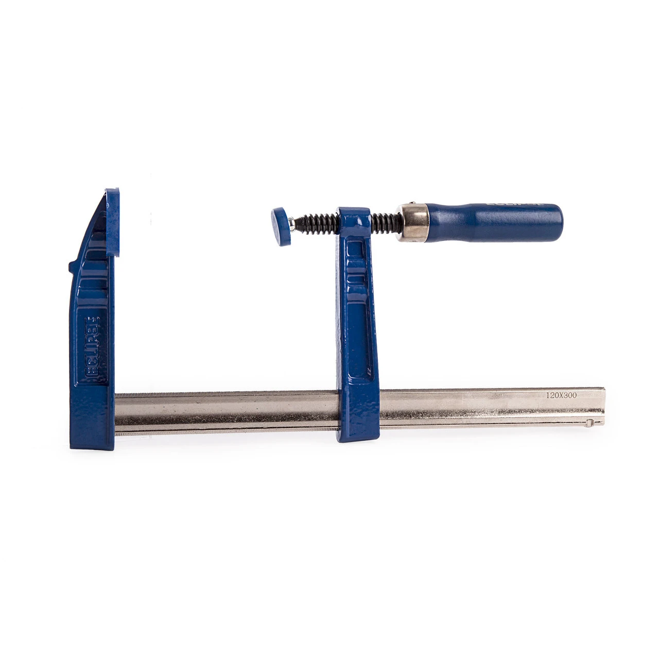The Eclipse EC-SCR12 12 Inch Screw Clamp has a 120mm throat depth. These clamps are manufactured to DIN5117 with an average clamping force of 300kgf. The sliding head quickly sets the clamp to the required capacity, whilst the serrated grooves on the corrosion resistant nickel-plated bar prevent slippage in use. The cast iron malleable heads offer maximum strength and the wooden handle provides a firm and comfortable grip.