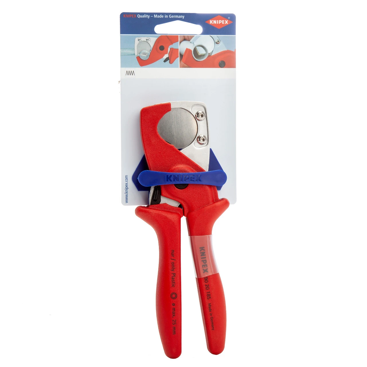 The Knipex 9020185SB (carded) PlastiCut Cutter has been designed for cutting thin-walled plastic pipes (armoured pipes) and hoses made of soft plastics and rubber (also fabric reinforced) up to an outer diameter of 25 mm. Thanks to the trapezoidal shape, the blade firstly cuts wedge-shaped into the material. The manual force initially acts on the tip of the blade and, during the cutting process, follows the shape of the material in a circular (radial) way from the inside out and onto the material. This prevents distortions as can arise when cutting using a conventional shearing action with two straight cutting edges. The trapezoidal shape has other benefits. Due to the exact positioning of the material in the hose and protective pipe cutter and the wedge-shaped blade, the pipe cutter automatically produces right-angled cuts. After cutting, no finishing (e.g. deburring) is required on the cut edges. Whether cutting plastic armoured pipes or fabric-reinforced hoses – e.g. for compressed air: the effort required is low due to the favourable angle of entry of the blade. Little effort is needed because the material has already been cut into. The opening spring assumes the work of opening for the user during each cutting operation. The spring presses the handles apart and opens the shears while reducing manual force. This is a great advantage, especially during large projects with several work processes. A pawl is integrated for transport. The material to be cut is positioned and secured in the wide, half round support. The pipe cutter for hoses and protective pipes ensure the right-angled position of the material to the blade. This enables cuts to be made in quick sequence using the pipe cutter for hoses and protective pipes.