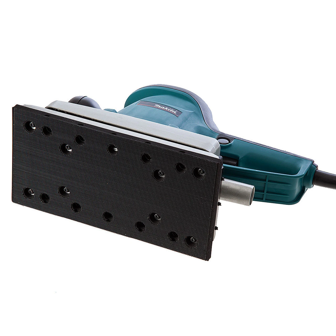 The BO4900V from Makita has been ergonomically designed and boasts a powerful 330W motor for superior handling and a quickly achieved super smooth finish. The soft-grip handle provides a non-slip surface for comfortable operation. Coupled with the knob style front handle and the low hand-shaped motor housing there are a variety of comfortable holding positions. There are large clamps for holding the sandpaper securely in place. The sander base also has a Velcro-style surface which hook and loop abrasive paper will stick to. There is a through the pad dust collection system which sucks dust through 10 holes on sander base into the dust bag. The BO4900V can alternatively be connected to a vacuum cleaner. Either way, the working environment will be healthier with much less cleaning up afterwards.