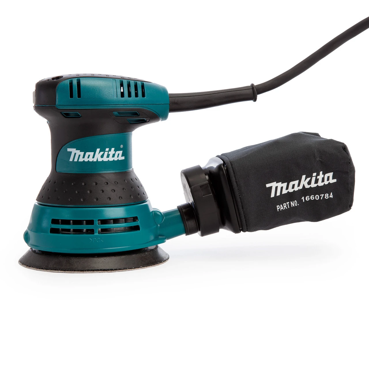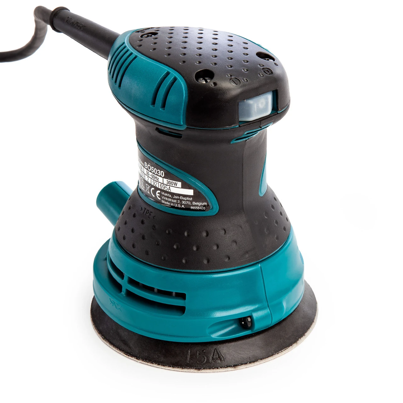 With its powerful 300W motor and orbit action for heavy-duty applications, the Makita BO5030 sander is ideal for just about any sanding application. The ergonomically contoured grip with a non-slip elastomer covered surface fits in the palm of your hand perfectly making it comfortable in use. This model was developed as the successor model to the BO5010 and BO5012, only now has an improved through the sheet dust extraction system for efficient dust management. 8 holes in the sandpaper sheet draw dust through the machine into the bag at the rear. It uses velcro style sanding discs which are quicker and more efficient to use and change.
