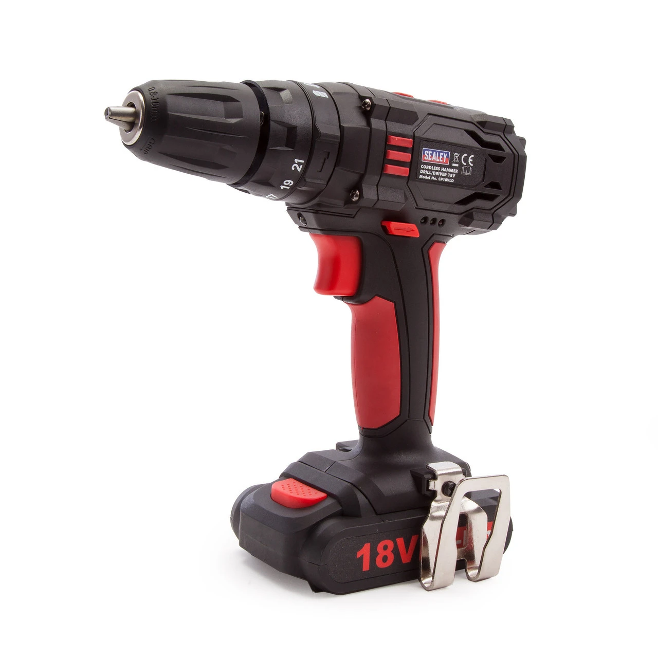 The Sealey CP18VLD Hammer Drill/Driver features a metal belt clip