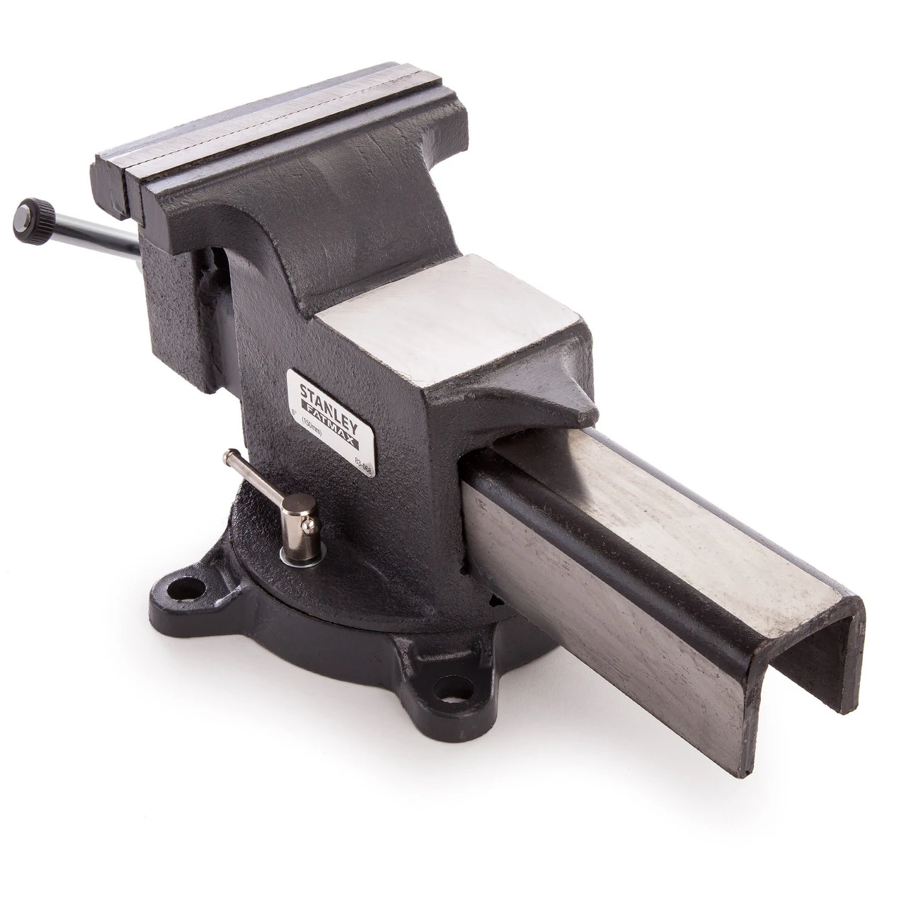 The Stanley 1-83-068 is 14kg cast iron vice with a 6 inch clamping capacity and a clamping force of 2200kg. It has a lockable swivel base which allows you to position the work piece and use the safest working position rather than compromise, as you would with a fixed vice. There are three holes in the base of the Vice to attach securely to a workbench.