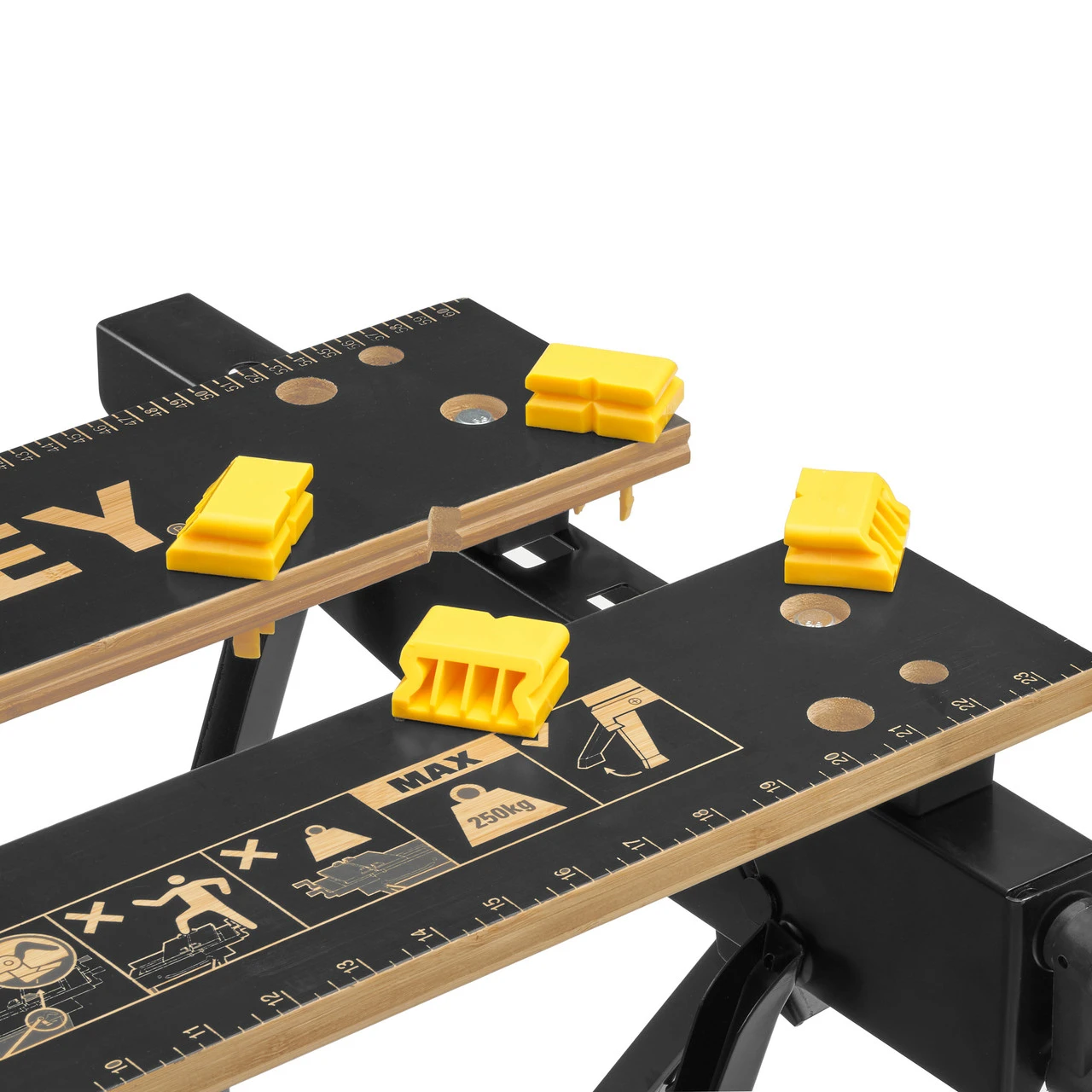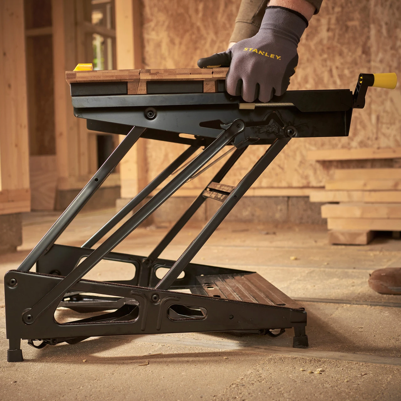 The STANLEY 2-in-1 Workbench & Vice features a dual height design (595mm and 775mm) and 250kg load capacity for versatile adaptation as a workbench, tool stand, vice or sawhorse and also features a removable bamboo panel that converts the vice to a workbench in one easy move. It includes adjustable swivel pegs for larger or awkward-shaped materials to be held firmly in place, as well as integrated V-grooves for easy sawing of pipes. The STANLEY 2 in 1 Workbench & Vice folds flat for easy transportation and compactly stores away in any garage or workshop.